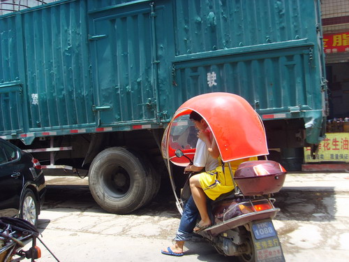 望见可挡风遮雨避暑的摩托“遮阳篷”,市民