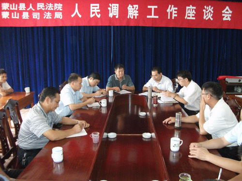 为贯彻实施《中华人民共和国人民调解法》,加强和创新社会管理,促进蒙山县诉调工作深入开展。8月10日下午,该县人民法院、县司法局在司法局会议室联合召开人民调解工作座谈会。县人民法院、县司法局领导及有关人员参加会议。