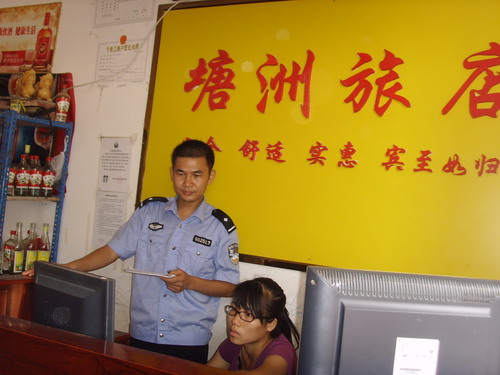 《旅客住宿登记表》的“常住地址”要写清楚,在塘洲旅店,民警卢锐勇一边查看记录一边交代服务员。
