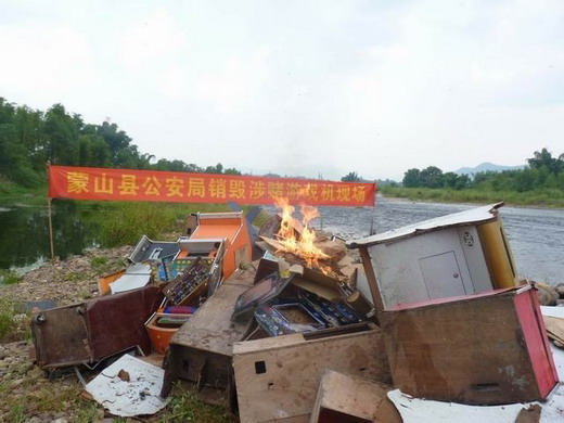 近日,蒙山县公安局民警在蒙山镇高堆村的河边集中销毁了一批赌博游戏机。当日下午16时许,50多台被查获的赌博机在熊熊大火中化为灰烬,许多群众目睹了销毁赌博游戏机活动全过程,并对公安机关重拳打出利用游戏机进行赌博违法犯罪活动拍手称快。