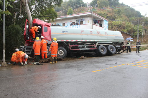 2012年1月4日中午,一辆由蒙山往陈塘方向行驶满载13吨汽油的桂K79287号大型油罐车,在国道321线428公里900米寺村桥头处因雨天路滑侧翻在路边,驾驶员被困驾驶室,路边是10多米高的小河里,情况十分危急。警情发生后,蒙山县公安局交警大队副大队长黄建军带领黄村中队民警冒雨第一时间赶赴现场,为了防止油罐车滑下路边10多米的小河里,交警拿来几条手腕粗的绳子拉住油罐车。当时在外地办事回蒙山经过事故现场的蒙山县委常委、政法委书记黄振国走下车,在雨中指挥事故救援工作。交警大队副教导员韦远林带领事故处理中队后续赶到,与消防大队、医疗机构一起开展救援工作,经过20分钟的艰难奋战,终于顺利将驾驶员安全救出。事故发生45分钟后道路即恢复通车。
