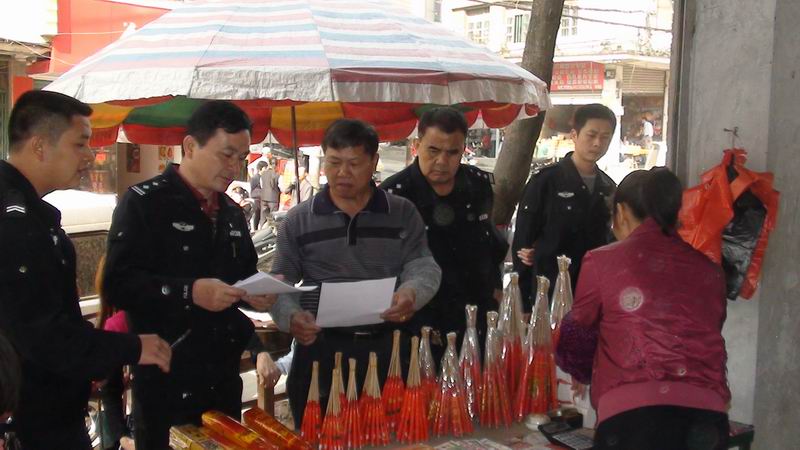 北山路地处岑溪市中心地带,周边居民密集,此路街道狭窄,人流量大、车流量多,两旁时有占道经营现象,常造成人车拥堵,而街道两侧多为非法经营烟花爆竹的摊点,存在很大的安全隐患。为保证春节期间社会安全稳定,让人民群众欢度一个欢乐祥和的新年,针对上述现状,按分管的刘朝副局长指示,由治安大队牵头,会同辖区派出所对北山路非法经营烟花爆竹的商铺、摊点进行整治取缔,确保人民群众的生命财产安全。