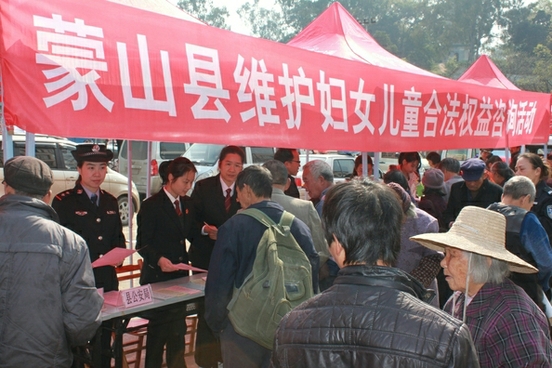 去年“三八”妇女节前夕,蒙山县法院的女法官也冒雨上街参加了妇女儿童维权岗宣传活动,此项活动作为零距离接触广大群众的一个平台,蒙山法院将继续坚持做好这项工作,让更多的妇女儿童在生活中能够运用法律武器维护自己的合法权益。