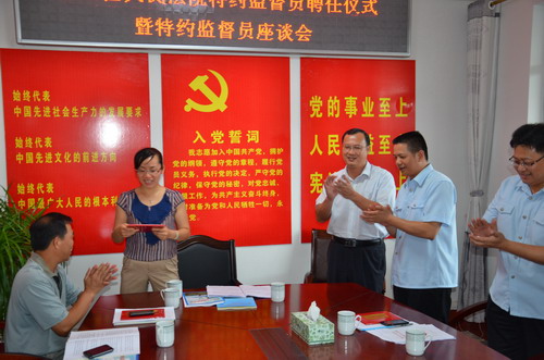 蒙山县委常委、统战部长马涌涛指出,聘任特约监督员是县人民法院接受社会监督的主动落实,而来自人大代表、政协委员工商联和无党派人士等不同行业的特约监督员,具有广泛的代表性,特约监督员制度体现了人民法院工作和统一战线工作相互支持和促进。他要求各特约监督员加强联络、沟通、宣传和监督职责,发现问题及时反馈、督促整改,支持法院做好司法审判工作,实现司法公平正。