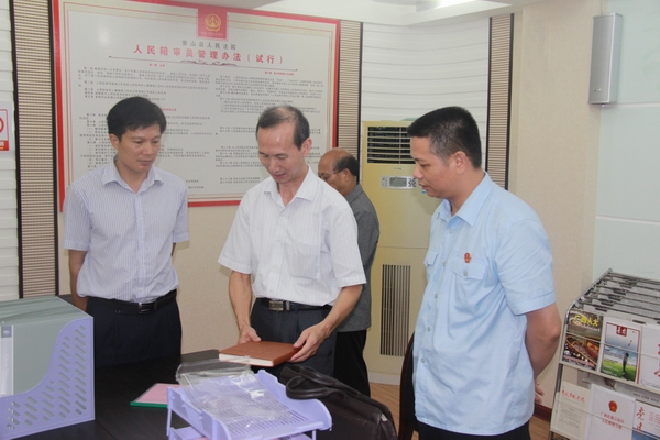 图片说明:杨铁庄(中)视察人民陪审员工作室