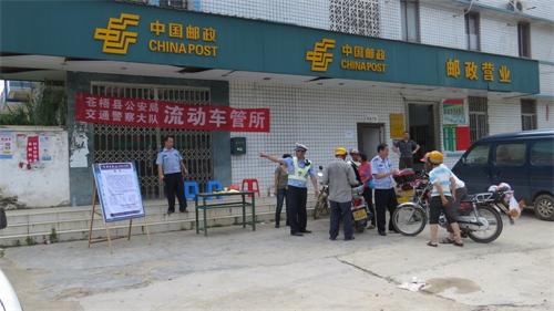 近日,苍梧交警大队车管所组织民警联合苍梧县邮政部门人员利用乡镇圩日到各乡镇开展办理车管业务和宣传活动,车管所民警一边给群众办理车管业务,一边宣传公安部123、124号令,使广大农村群众更深刻了解到道路交通安全法的知识。