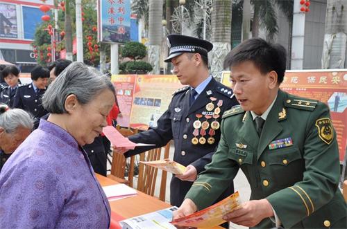 为了进一步加强群众的安全防范意识,增强法律观念,2013年11月14日,岑溪市公安局组织指挥中心、治安、禁毒、交警、消防等部门10余名民警深入人流较为密集的义洲社区开展“典型宣传”活动,公安局政委黄云龙、全国优秀人民警察——朱少华出席了活动宣传。